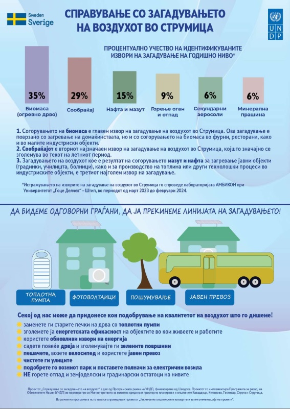 Според објавените резултати во инфографиката за справување со загадувањето на воздухот во Струмица, најголем удел во годишното загадување има согорувањето на биомаса (горено дрво) со 35%, по што следуваат сообраќајот со 29%, нафтата и мазутот со 15%, горењето ѓубре и отпад со 9%, како и секундарните аеросоли (6%) и минералната прашина (6%).