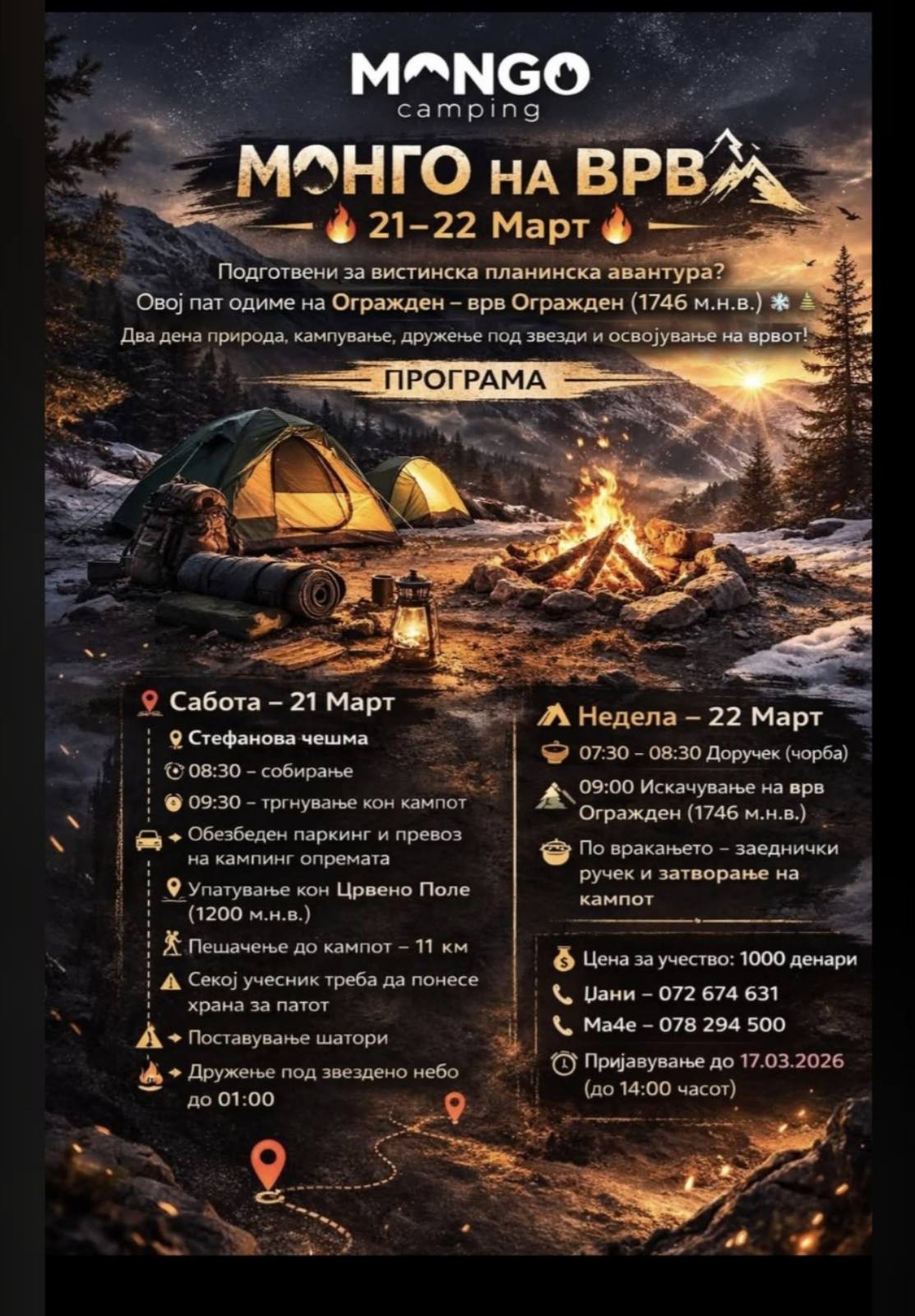 Во организација на „Mongo Camping“, на 21 и 22 март ќе се реализира дводневна планинска авантура до врвот Огражден, висок 1746 метри. Настанот е наменет за љубителите на природата, кампувањето и планинарењето, кои ќе имаат можност да доживеат дружење под ѕвездено небо и искачување на еден од најубавите планински предели во регионот.