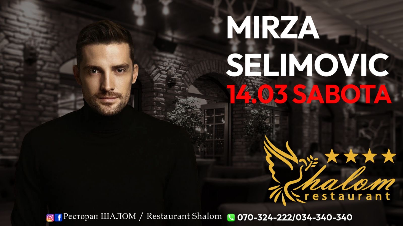 Ресторан „Шалом“ најавува вечер исполнета со одлична атмосфера, емоции и врвна музика со настап на Мирза Селимовиќ. На 14.03, сите љубители на добрата музика ќе имаат можност да уживаат во незаборавна вечер во пријатниот амбиент на Ресторан „Шалом“.