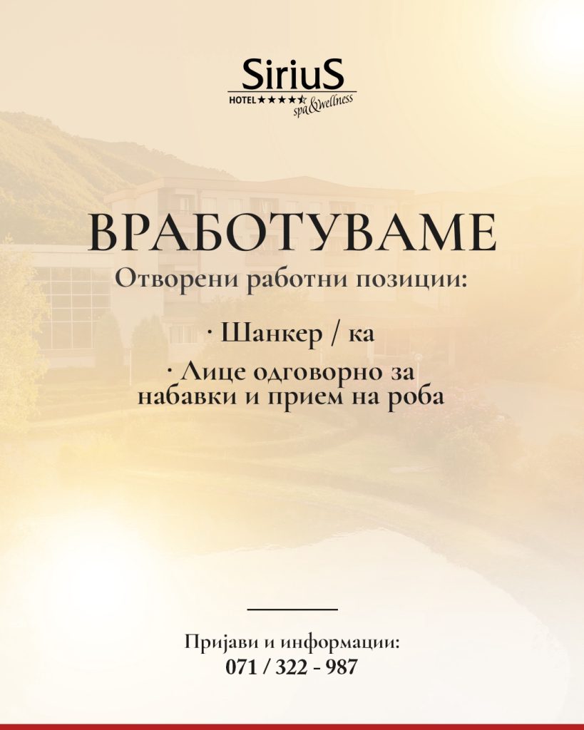 Хотел „Сириус“ вработува МАГАЦИОНЕР и ШАНКЕР/КА. Сите заинтересирани може да …